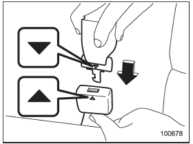 1. Insert a key or other hard pointed object into the slot in the connector (buckle) on the right-hand side and push it in, and the connector (tongue) plate will disconnect from the buckle.