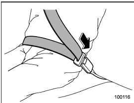 When wearing the seatbelts, make sure the shoulder portion of the webbing does not pass over your neck. If it does, adjust the seatbelt anchor to a lower position. Placing the shoulder belt over the neck may result in neck injury during sudden braking or in a collision.